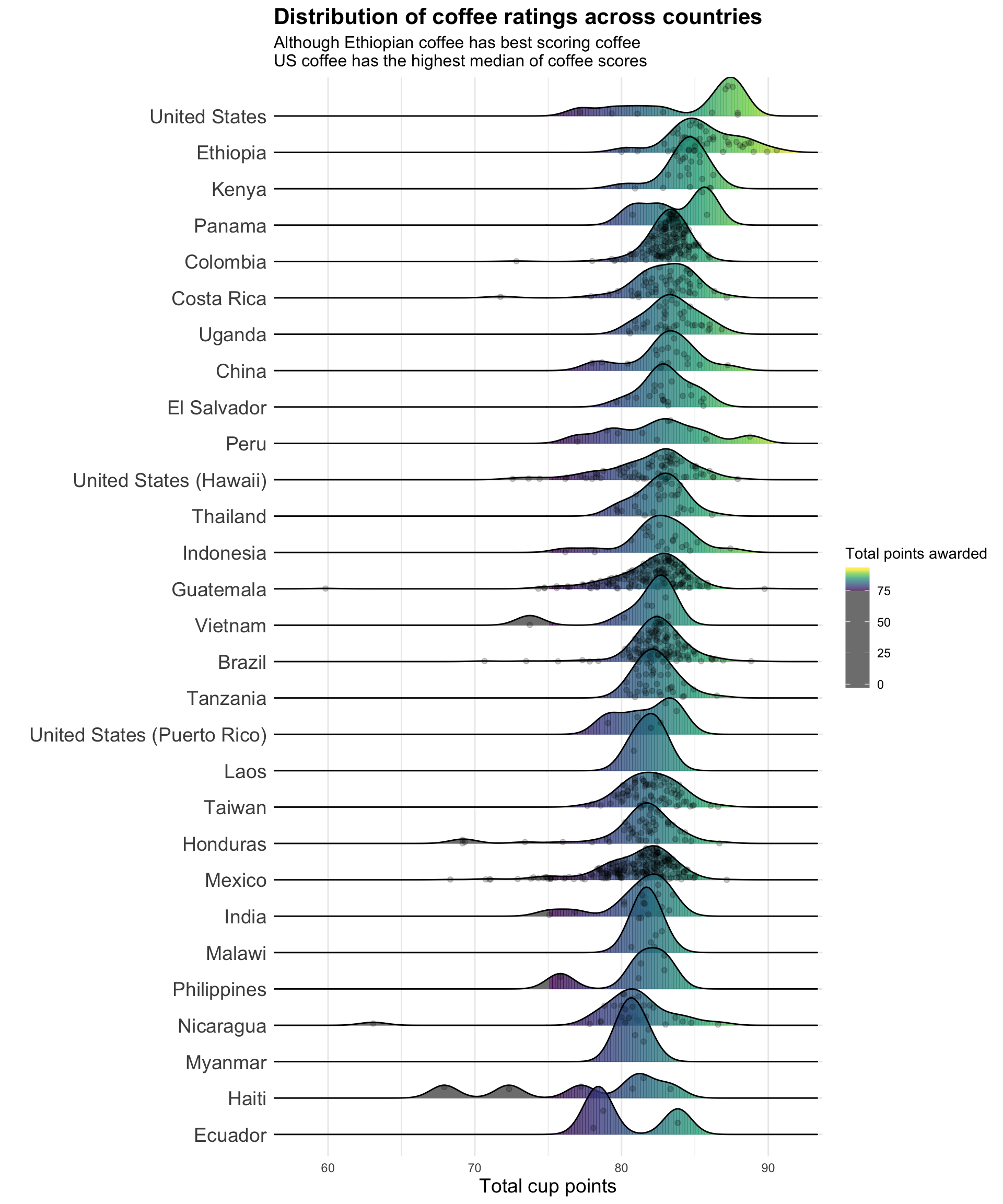 subtitle = "Although Ethiopian coffee has best scoring coffee \nUS coffee has the highest median of coffee scores",